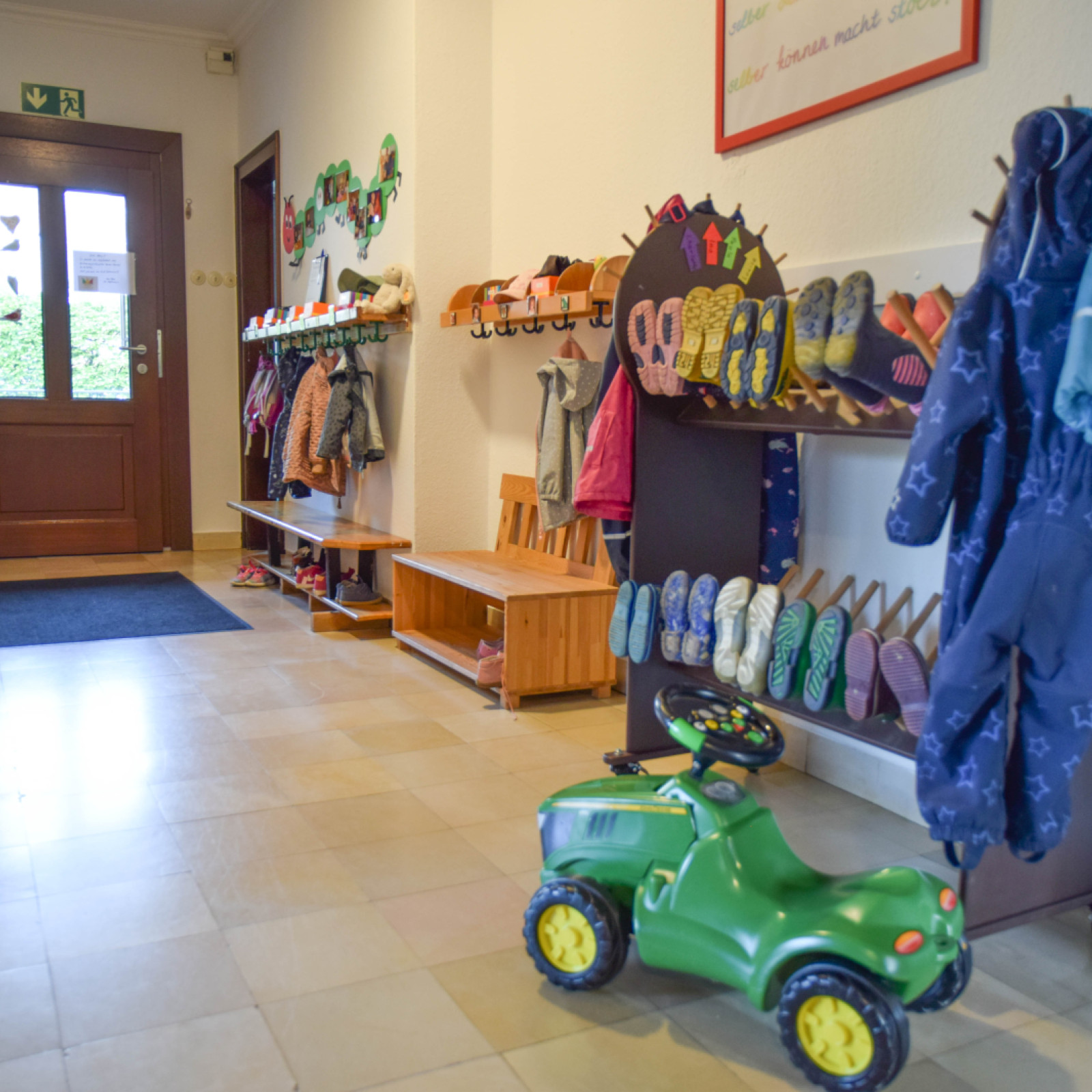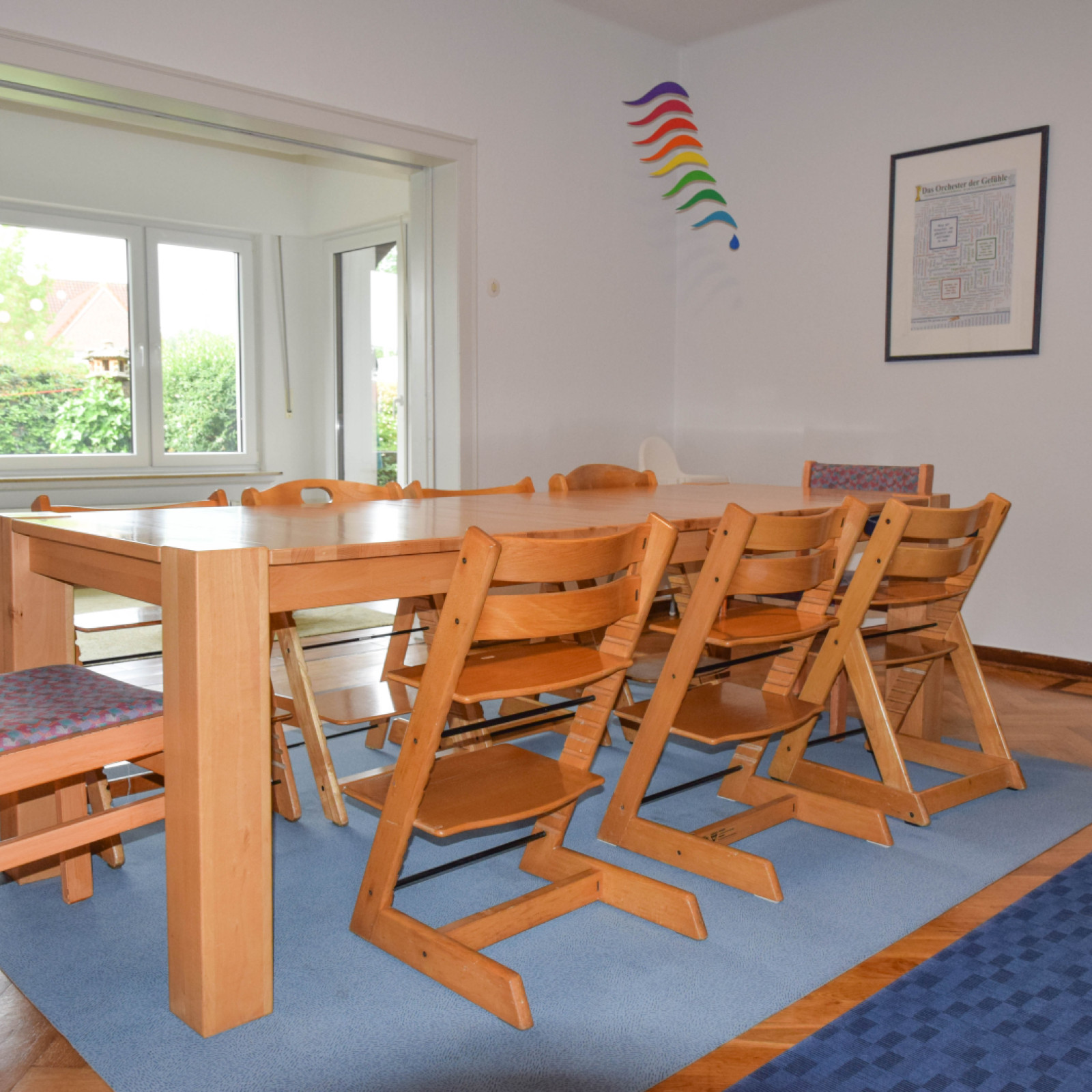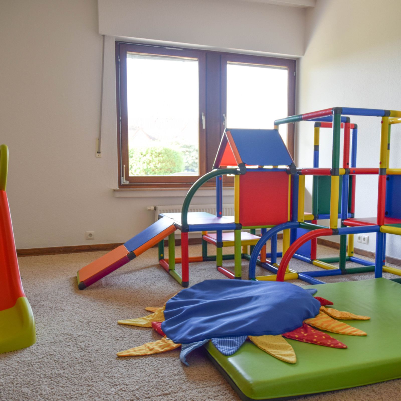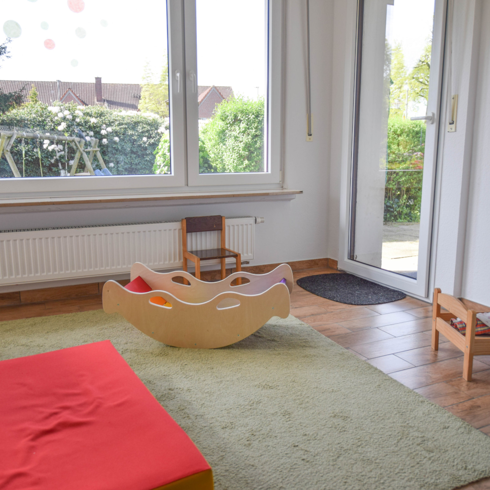 Ein Schlafraum, ein großer Gruppenraum, ein Esszimmer sowie ein Wintergarten sind zusätzliche Nutzräume, in denen die Kinder die Möglichkeit haben, sich altersgerecht zu beschäftigen.