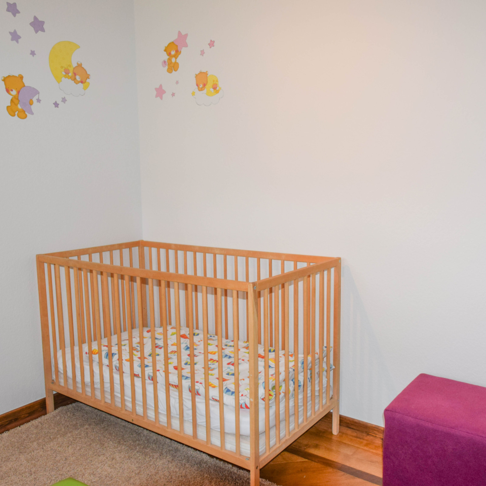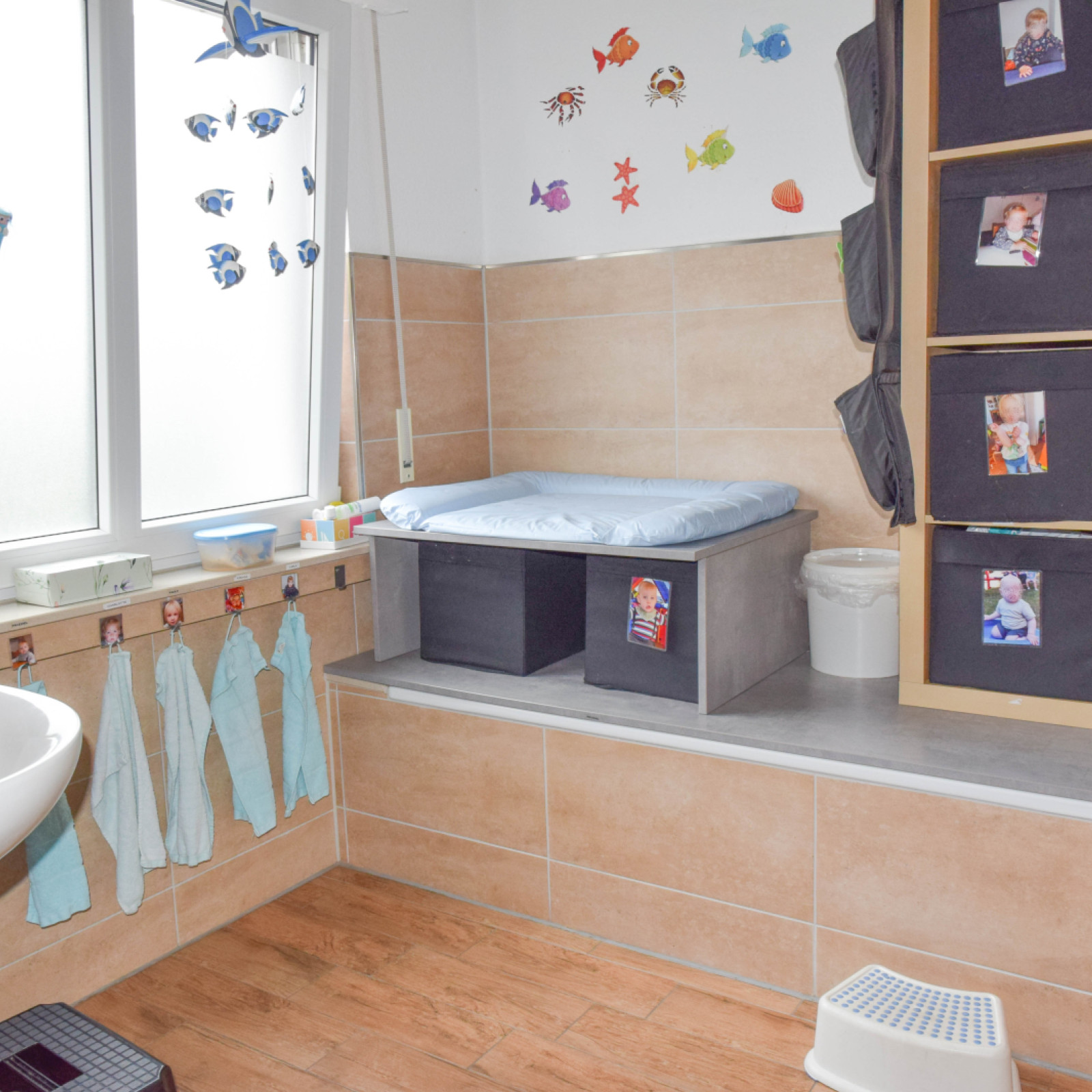 Im Erdgeschoss stehen uns ein Bad mit Wickeltisch, Töpfchen, Toilettensitz und rutschfestem Tritt zur Verfügung.
